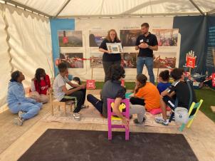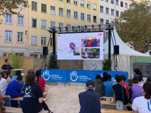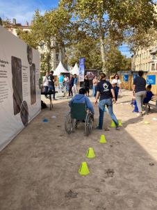 La sortie se déroulait sur la place de la Croix-Rousse. Plusieurs stands y étaient installés. Nous avons commencé par écouter des personnes expliquer leur travail (démineurs etc.), puis des ateliers étaient proposés pour pouvoir se mettre dans la peau d’une personne porteuse de handicap (amputée, sourde…). Nous avons ensuite eu la chance de participer à une interview : certains élèves ont pu poser leurs questions à Mme Mugisho, psychologue à Handicap International.{{}}