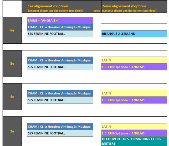 Les élèves choisissent/poursuivent zéro.une.deux options en 5EME et les conserve en 4EME et 3EME.